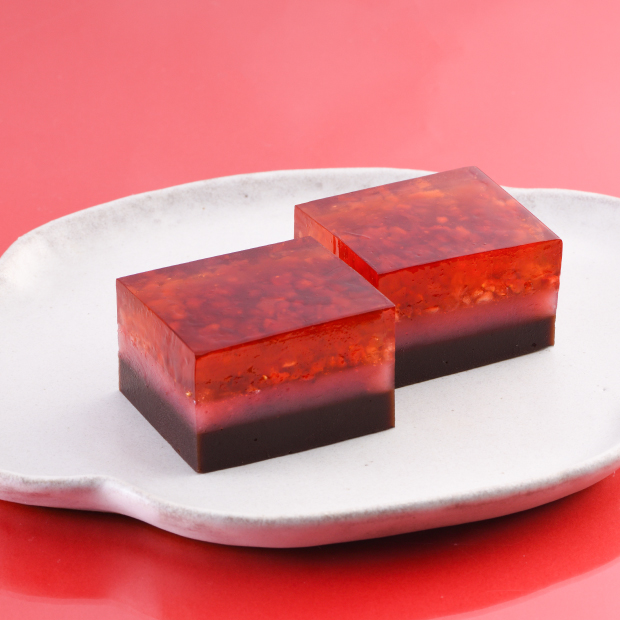 | 内 容 | 甘酸っぱい苺のフレークを散らした錦玉羹に苺風味の羊羹と濃厚な味わいのチョコレート羊羹をかさね合わせた季節限定の細工羊羹です。 |